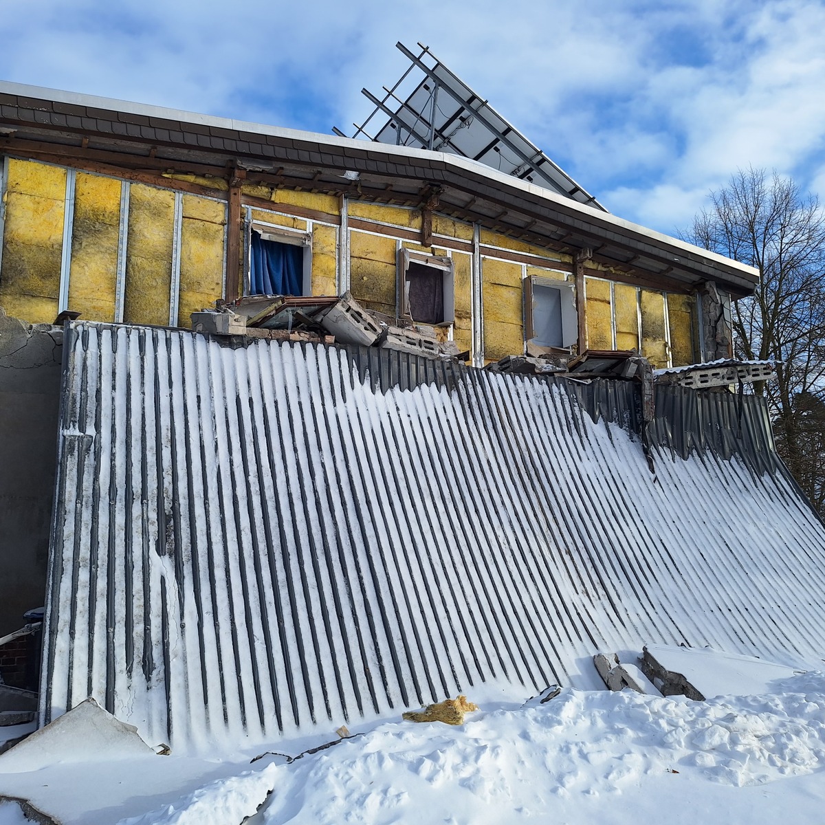 Ein großes Vordach mit einer Größe von etwa 4 × 12 Metern konnte der hohen Schneelast nicht mehr standhalten und stürzte ein. Durch den Einsturz wurden zudem Teile der Außenfassade mitgerissen, wodurch der Haupteingang des Gebäudes verschüttet wurde.